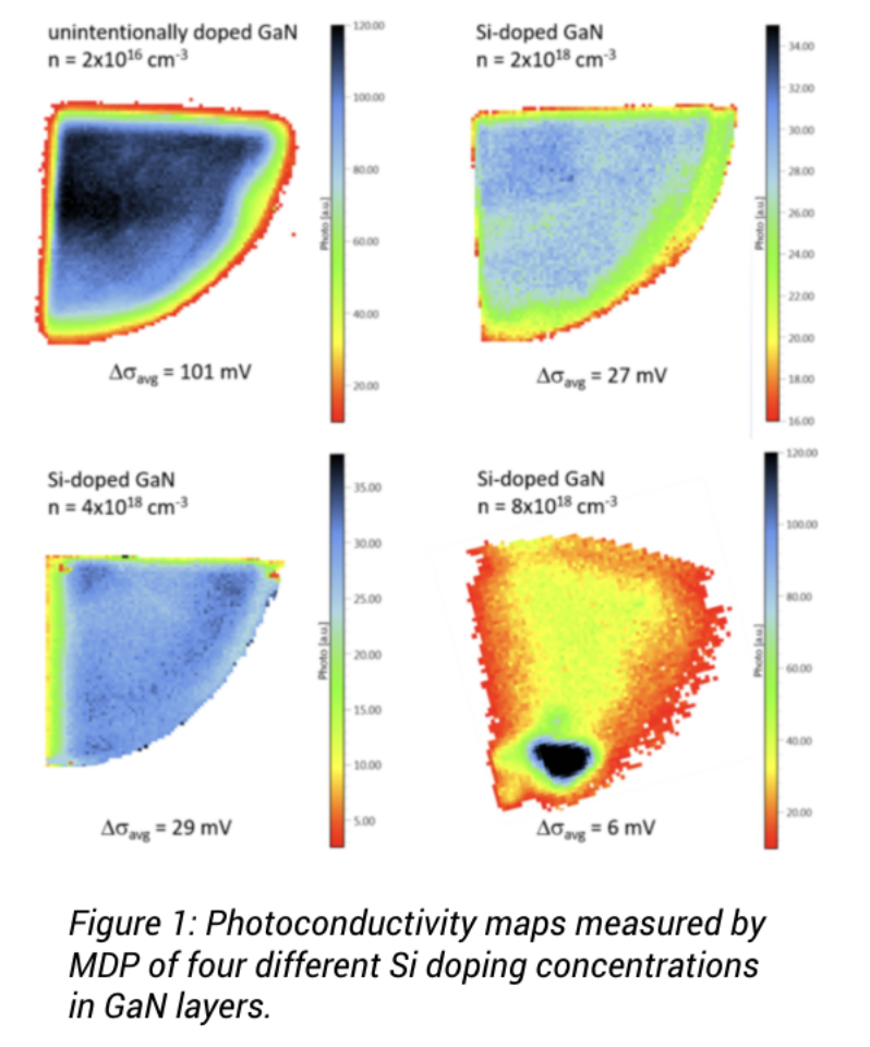 弗莱贝格仪器(Freiberg Instruments)的MDPmap与MDpicts系统,配备355nm激光器(适配瞬态微波光电导衰减法μ-PCD)或375nm激光二极管(适配稳态微波光电导法MDP),适用于宽带隙氮化物半导体的光电导测量与陷阱态分析。n 型掺杂的均匀性可通过光电导信号(信号强度)进行分析,该信号与材料的电阻率及载流子寿命密切相关。